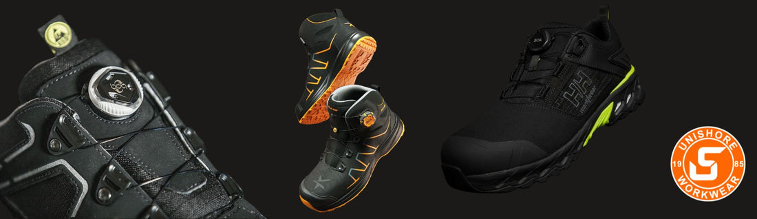 Da ein BOA-Verschluss dafür sorgt dass der Schuh gleichmäßig festgezogen wird, wird das Risiko schmerzhafter Füße deutlich reduziert. BOA-Arbeitsschuhe verfügen über einen Edelstahldraht der mit einem Drehknopf festgezogen wird. Dadurch entfällt die Gefahr dass die Schnürsenkel in einer Maschine stecken bleiben oder Sie stolpern. Die Arbeitsschuhe lassen sich schneller und einfacher aus- und anziehen, sogar mit einer Hand. Im Gegensatz zu Schnürsenkeln hält ein BOA-Verschluss außerdem weder Schlamm noch Öl zurück. Dadurch ist ein BOA um einiges langlebiger als ein normaler Schnürschuh.