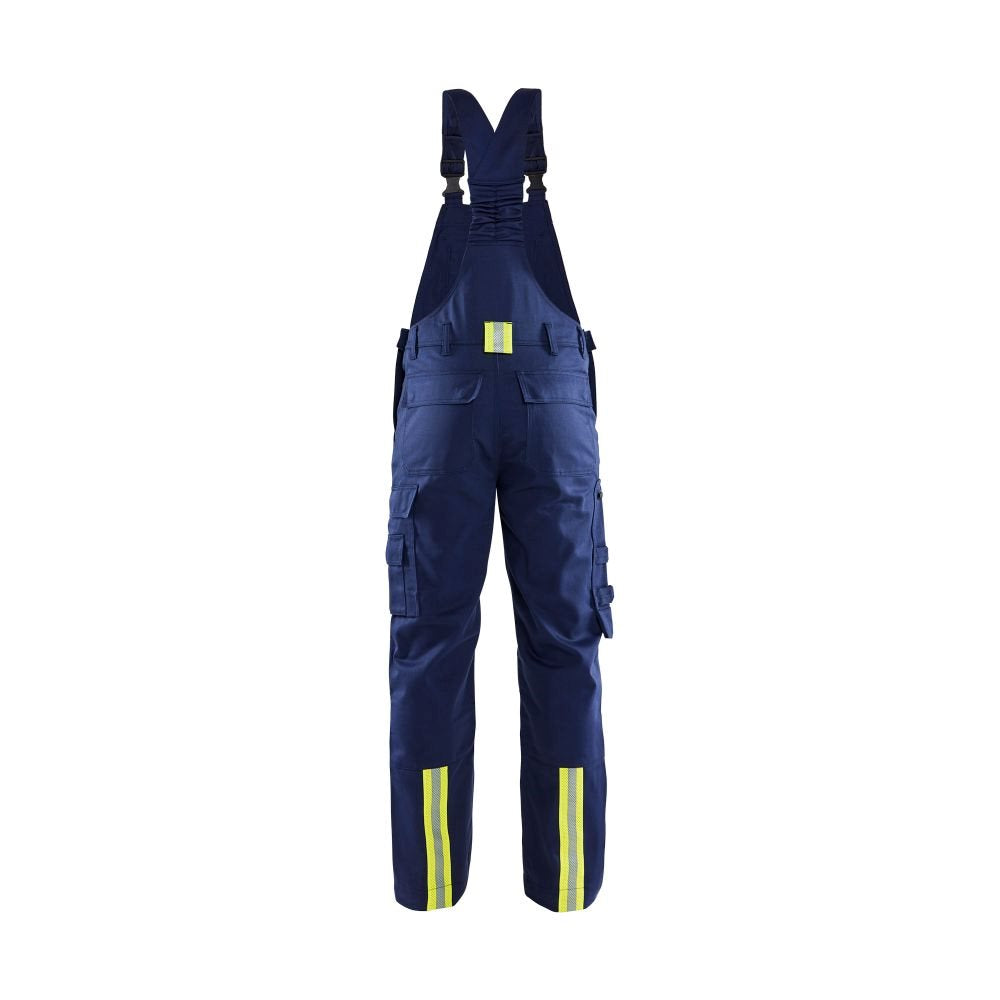 Hosenträgerhose der Marke Blaklader, speziell für Schweißarbeiten und ähnliche Arbeiten konzipiert. Die Hose lässt sich in der Taille mit Knöpfen verstellen und verfügt über eine Brusttasche, äußere Knietaschen, eine linke Beintasche, eine rechte Zollstocktasche und reflektierende Details auf der Rückseite, dem Unterschenkel und der hinteren Gürtelschlaufe. Industriell waschbar.