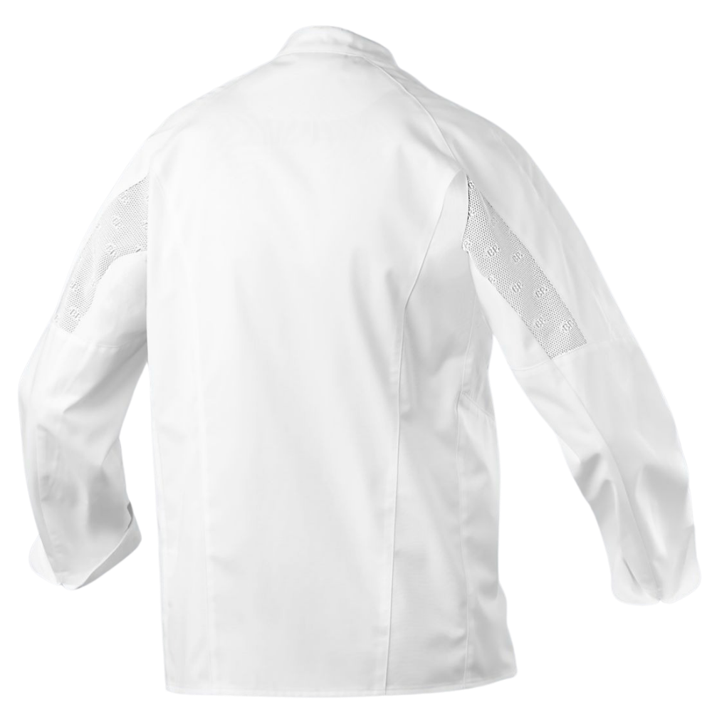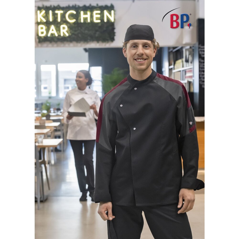 Die leichte BP® Kochjacke für Herren vereint modernes Design mit optimalem Tragekomfort. Dank des besonders leichten und weichen Materials ist sie ideal für lange Arbeitstage in heißen Küchen. Atmungsaktive BP® Mesh-Einsätze sorgen für hervorragende Luftzirkulation, während die ergonomisch geformten Ärmel und die eingesetzten Unterarm-Einsätze maximale Bewegungsfreiheit bieten.