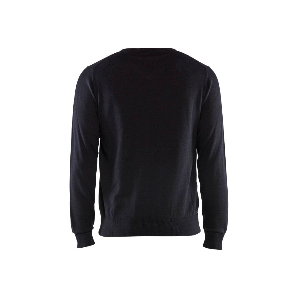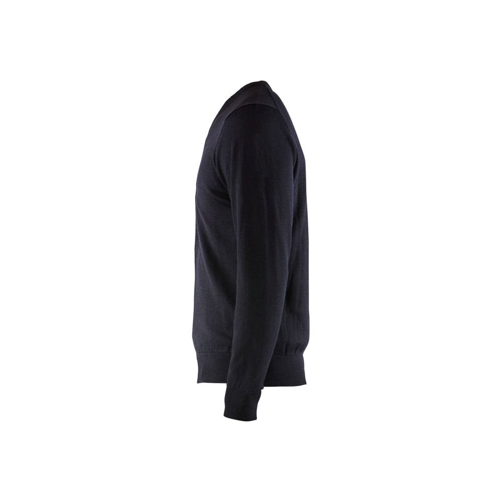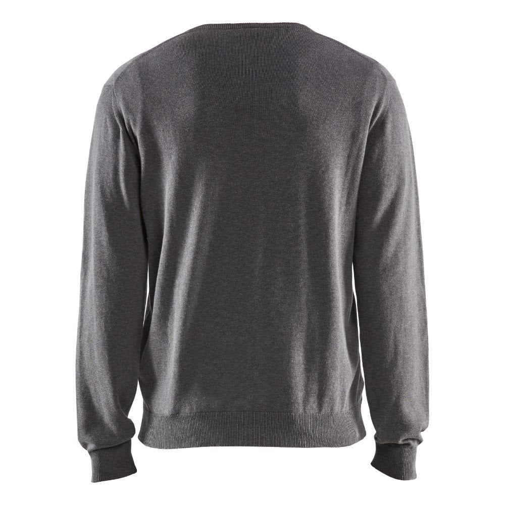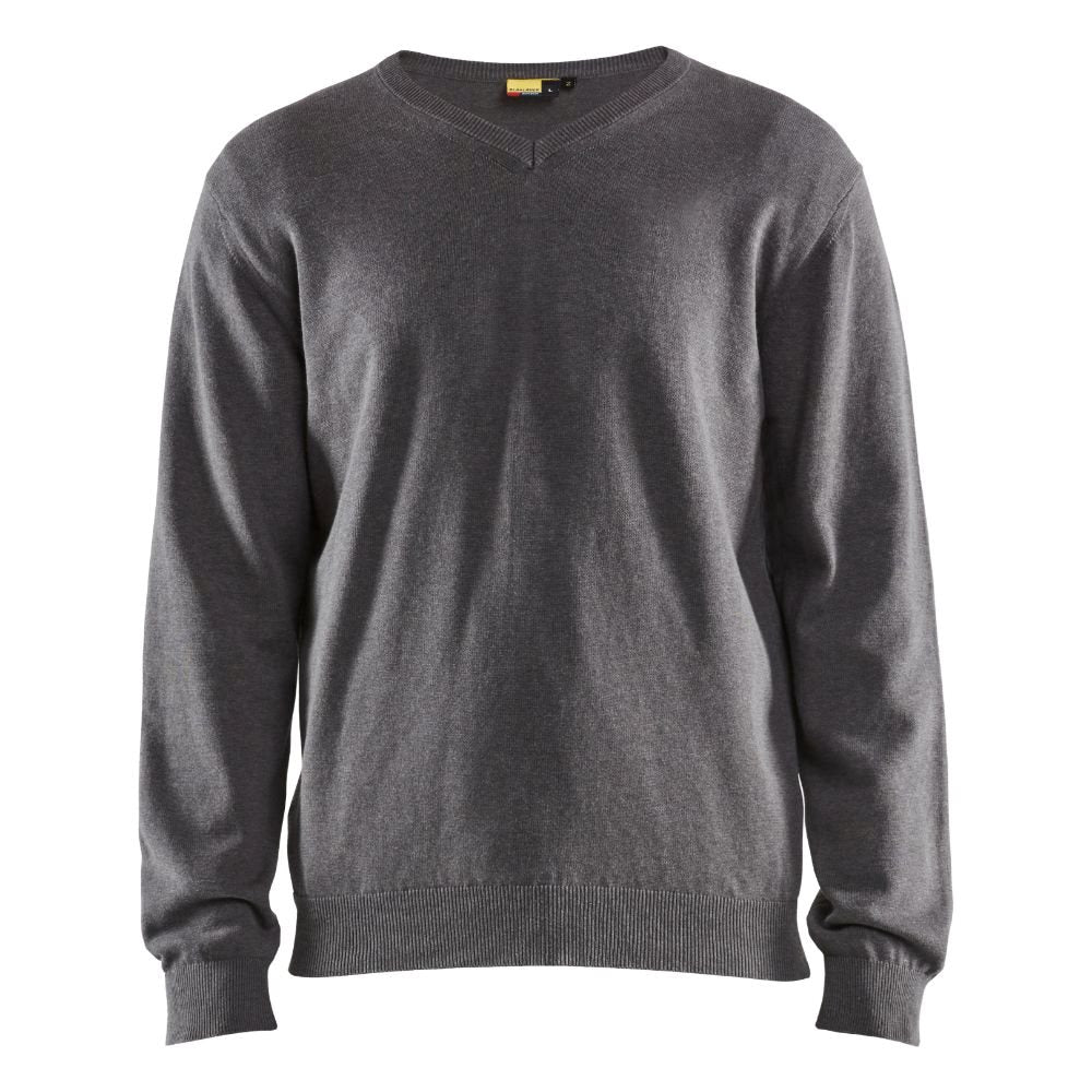 Gebreide v-hals pullover die perfect past bij Blaklader chinos 1465 voor een stijlvolle zakelijke look op het werk.