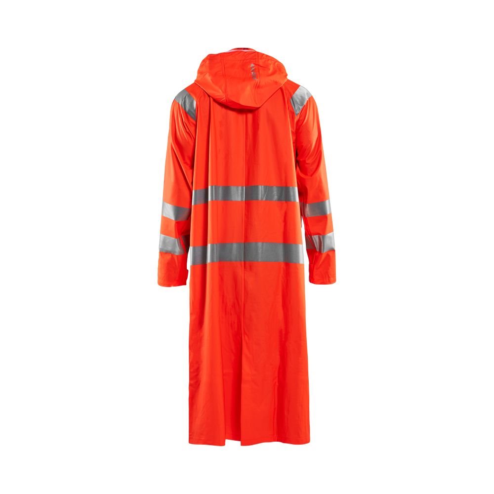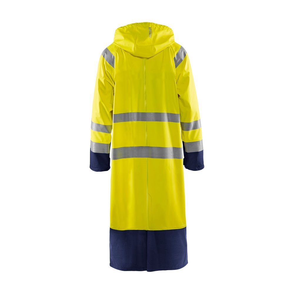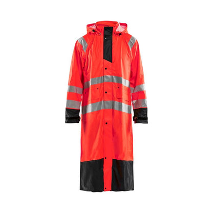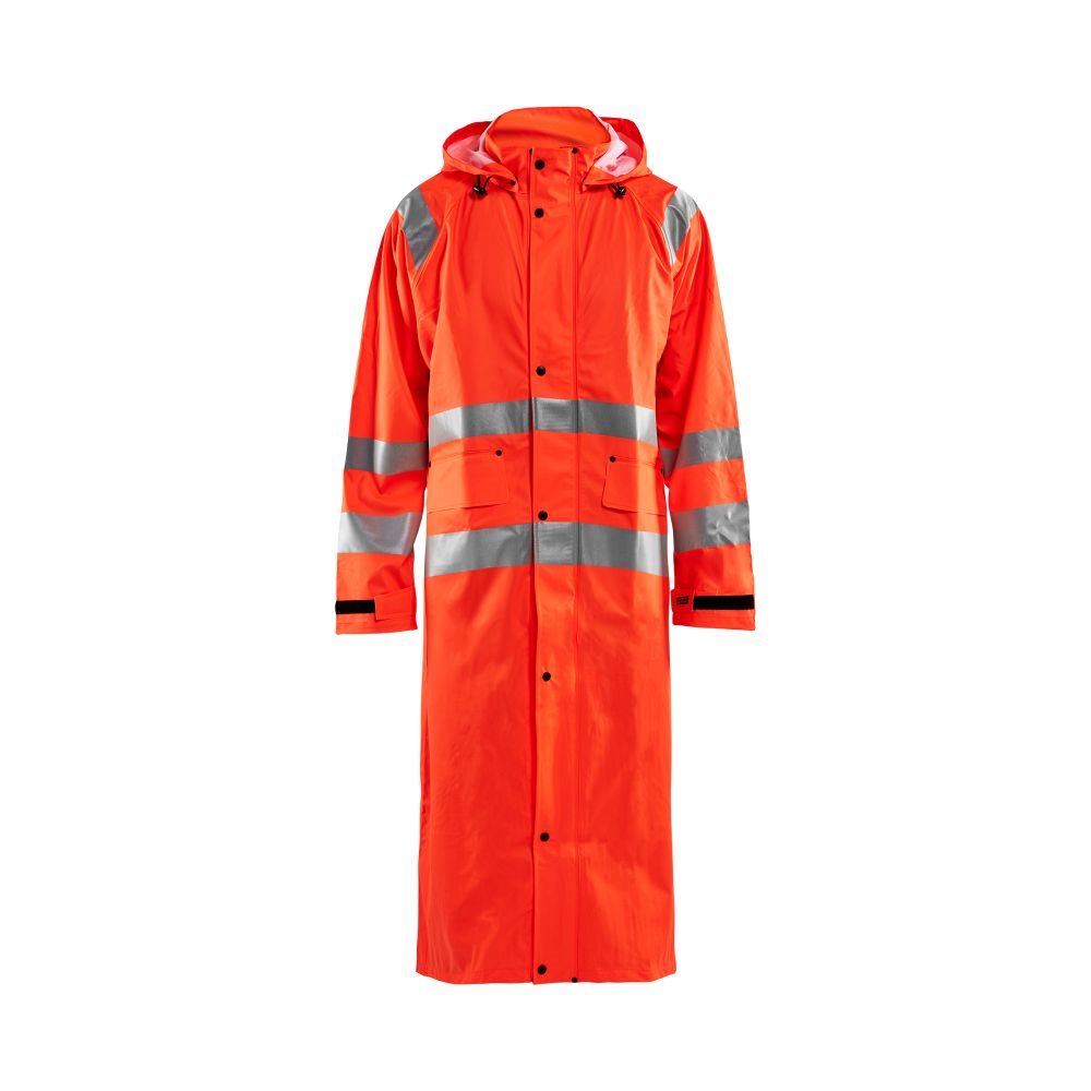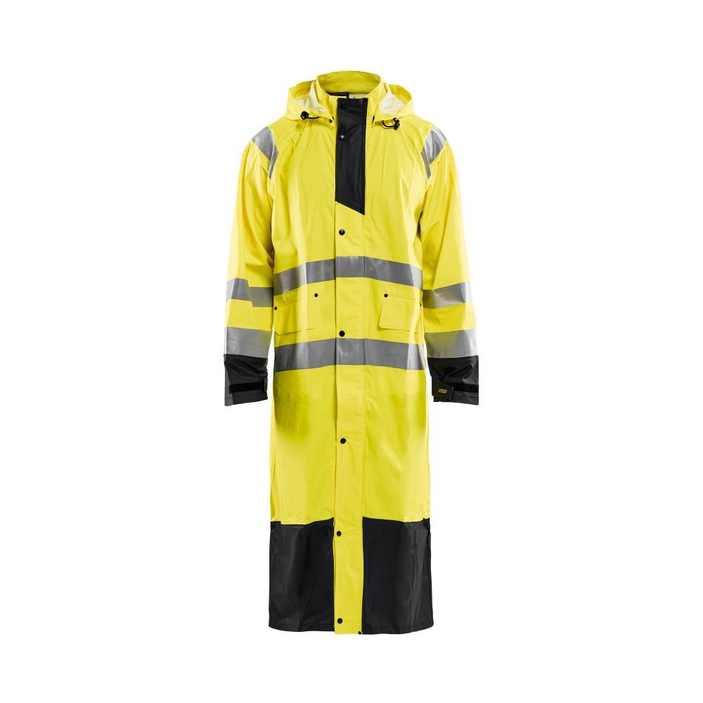 De Blaklader Regenjas High Vis LEVEL 1 4325-2000 is een High Vis regenjas voor diegenen met werkzaamheden die lichte en gladde regenkleding nodig hebben. Gemaakt van sterk wind- en waterdicht materiaal met gelaste naden en goede ventilatie. De sluiting is een sterke verborgen 2-weg ritssluiting met daarover een stormsluiting met drukknopen. De jas heeft een goede pasvorm, verstelbare manchetten met klittenband, een afneembare en verstelbare capuchon met trekkoordje en eenvoudig toegankelijke voorzakken.