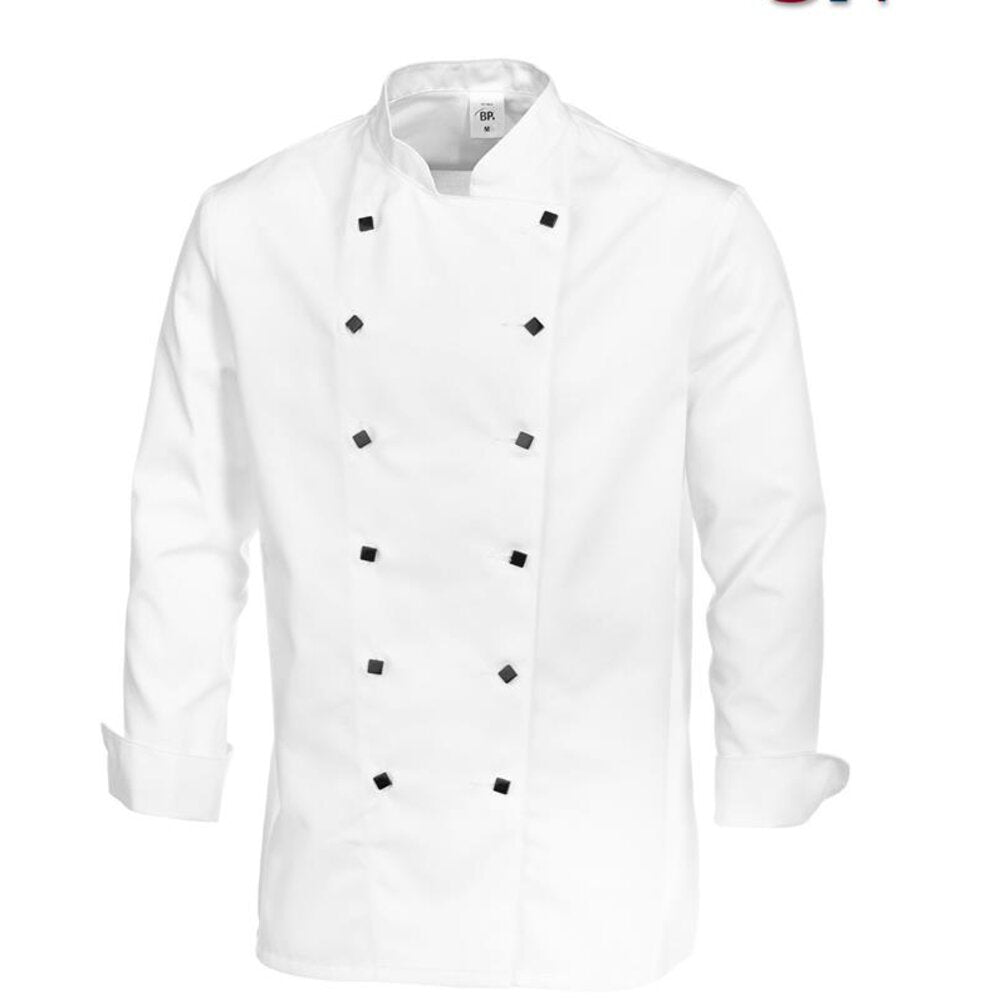 De koksbuis is uitgerust met lange mouwen met manchetten en een opstaande kraag voor een verzorgde, professionele uitstraling. Dankzij de dubbele rij knoopsgaten is de jas flexibel in gebruik en eenvoudig aan te passen. De ventilatieopeningen zorgen bovendien voor extra draagcomfort tijdens warme en drukke werkdagen in de keuken.