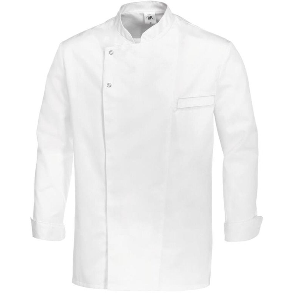 De BP® koksbuis is een praktische en comfortabele jas voor dagelijks gebruik in de keuken. De lange mouwen met manchetten en de opstaande kraag zorgen voor een verzorgde uitstraling, terwijl de blinde drukknopenlijst met twee zichtbare knopen een moderne en nette afwerking biedt. Ventilatieopeningen zorgen voor extra ademend vermogen tijdens warme keukensessies, en de paspelzak op borsthoogte biedt handige opbergruimte voor pennen of kleine keukenaccessoires.
