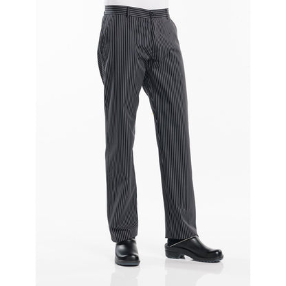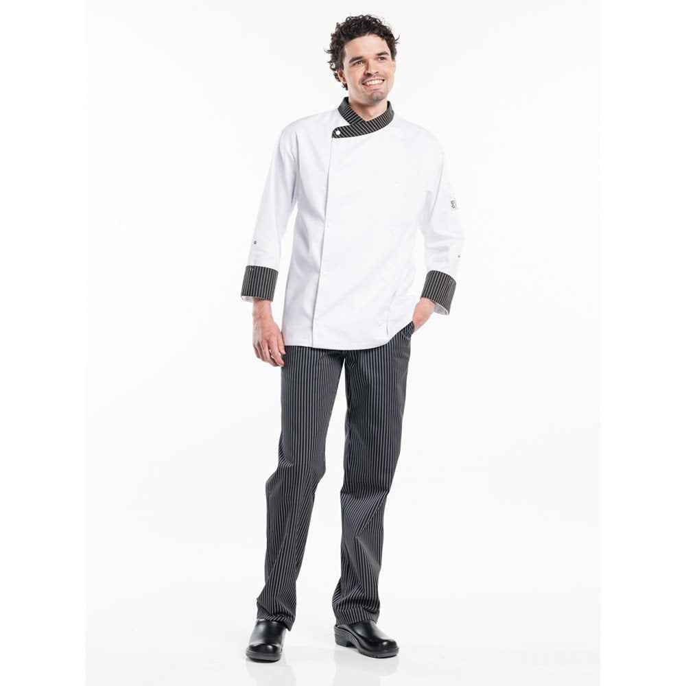 Luxe koksbroek Ligne Noir 159 van Chaud Devant kopen? De Ligne Noir koksbroek van Chaud Devant met Regular Fit heeft een pasvorm met rechte pijpen en valt comfortabel op de heup. Een vlot en modern model. De horecabroek is afgewerkt met elastiek in de rug voor een extra goede pasvorm en optimaal draagcomfort. De Ligne Noir kenmerkt zich door de witte krijtstrepen, die zorgen voor een strakke en verzorgde uitstraling.