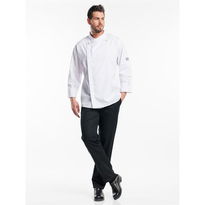 Chaud Devant Nero koksbroek 123 heeft een pasvorm met rechte pijpen en valt comfortabel op de heup. Dit vlotte en moderne model van het Nederlandse Chaud Devant is een van de best verkochte horecabroeken in ons assortiment. De koksbroek is afgewerkt met elastiek in de rug voor extra comfort, riemlussen en een metalen aannaaiknoop. De Nero is een perfecte, neutrale basis.