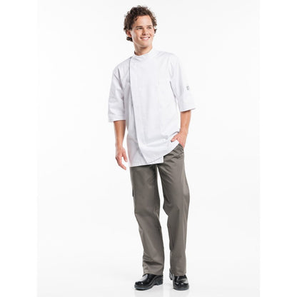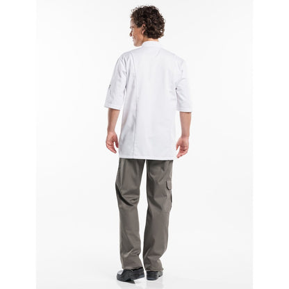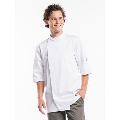 Koksbuis Bacio White Short Sleeve 938 kopen? De Bacio is een prima 'basic' witte koksjas met korte mouwen van Chaud Devant, maar de jas doet daarbij zeker niet onder in luxe. De blinde sluiting zorgt voor een chique, maar subtiele indruk. Bij de Bacio geldt 'Less is absoluut more'. De korte mouwen geven deze koksbuis een zomerse uitstraling en houden de chef koel tijdens de warmste dagen in de keuken.