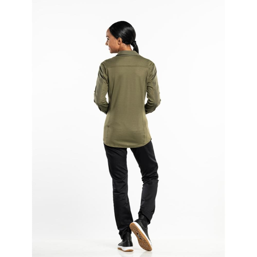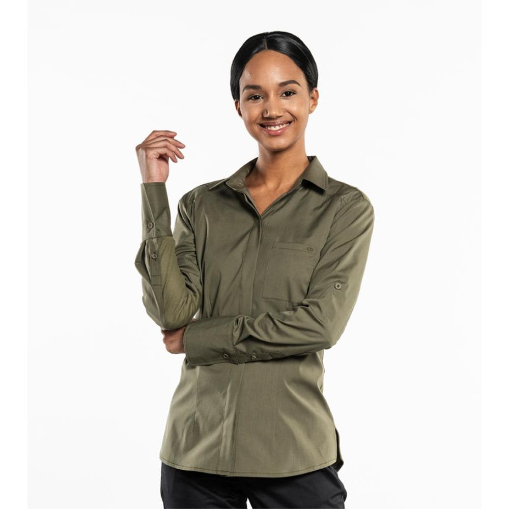 De Chaud Devant Women 625 Moss UFX Blouse is gemaakt van een zachte, kreukherstellende stof. De blouse heeft een comfortabele licht getailleerde pasvorm. Een heerlijke, representatieve blouse om in de bediening te dragen. Dankzij de stretch beweegt de blouse makkelijk mee met uw lichaam, en de gladde, geweven stof straalt kwaliteit uit. Zelfs als u het als gastvrouw heel druk heeft, voelt u zich nog prettig in deze blouse, dankzij de ademende achterpanden van milieuvriendelijke jersey. De blouse heeft een borstzakje, lange mouwen en een blinde sluiting met knopen. Dankzij de rustige Moss kleur heeft deze blouse een natuurlijke, unieke uitstraling. In de FX- collectie, waartoe deze blouse behoort, vindt u nog meer modieuze, duurzame kleding.