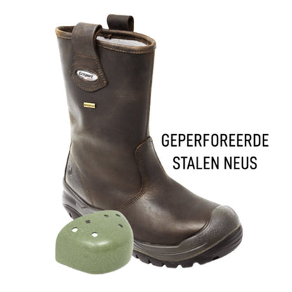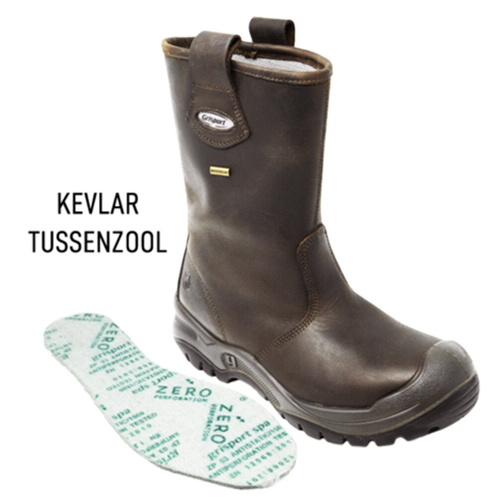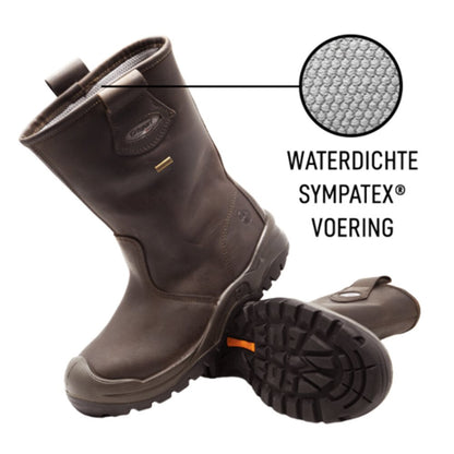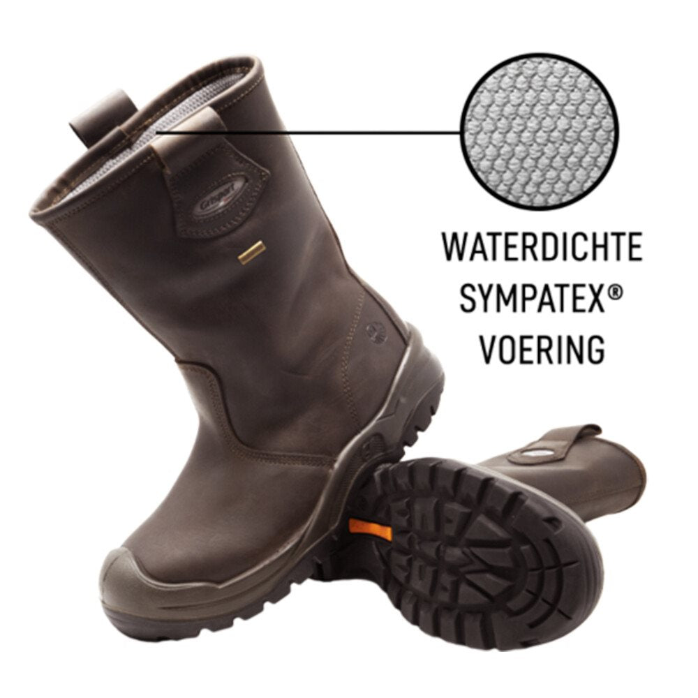 De Grisport 70249 S3 combineert veiligheid met een comfortabele pasvorm. De waterdichte sympatex voering houdt uw voeten lang droog en fris. De PU/Nitril zolen zijn gecombineerd met een kevlar tussenzool. Daardoor zijn deze S3 veiligheidslaarzen extreem slip- en slijtvast, olie-, zuur- en snijbestendig. De zolen van de Werklaarzen zijn bovendien bestand tegen extreme hitte tot circa 200 °C en kortstondige contactwarmte tot 300 °C. De stalen veiligheidsneus beschermt uw voeten tegen vallende voorwerpen met een energie tot 200 Joule.
