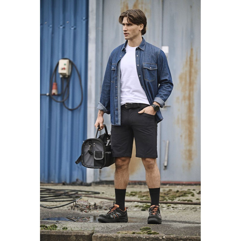 Jobman 2718 Service Shorts Stretch gemaakt van een 4-weg stretchstof. De short heeft een slim fit pasvorm. Voorzien van ruime voorzakken, paspelzakken op de achterzijde en een beenzak met rits en ruimte voor een telefoon en pennen.