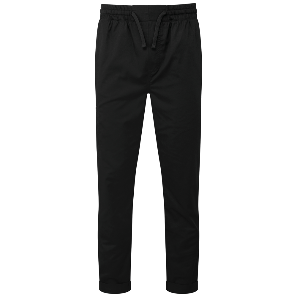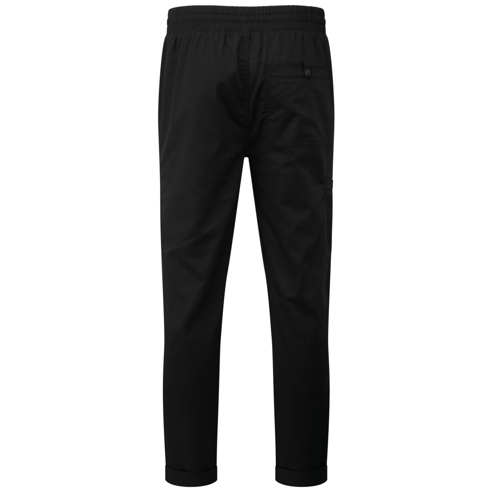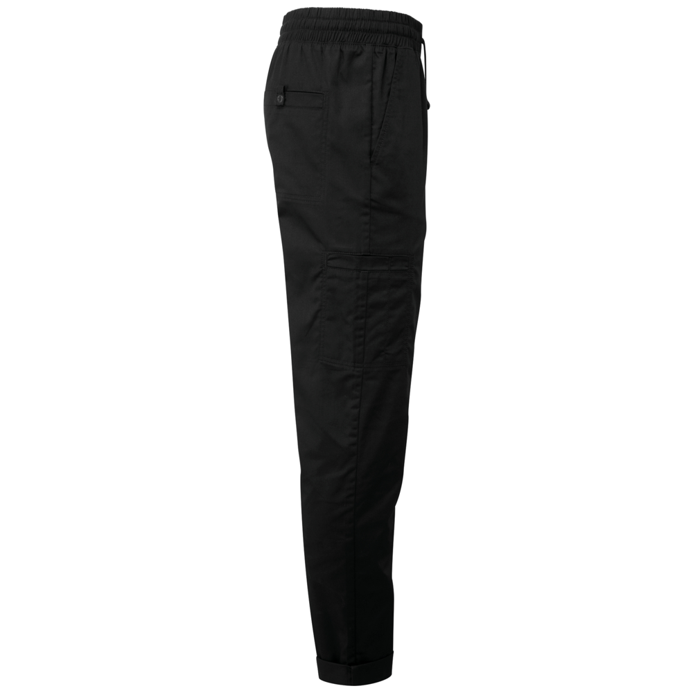 De elastische tailleband met trekkoord maakt het gemakkelijk de broek aan en uit te trekken, terwijl de nepnaad op de gulp zorgt voor een nette, professionele uitstraling. De taps toelopende broekspijpen met opgerolde zomen geven een moderne look en zorgen voor optimale bewegingsvrijheid. Meerdere praktische zakken bieden voldoende ruimte voor kleine keukenaccessoires.