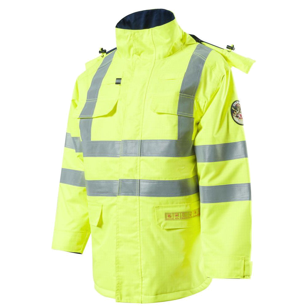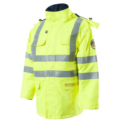 Buitenkant: 99% FR polyester / 1% antistatic , Voering: 100% FR cotton, 435 g/m2, IEC 61482-1-1: ATPV 25.9 cal/cm2